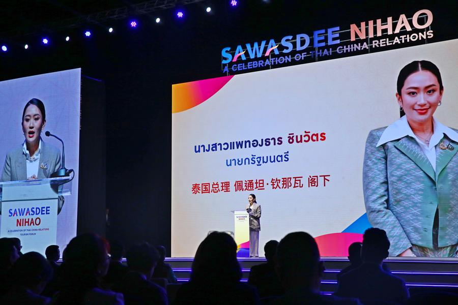 A primeira-ministra tailandesa, Paetongtarn Shinawatra, discursa na cerimônia de lançamento da iniciativa Sawasdee Nihao em Bancoc, Tailândia, no dia 29 de maio de 2025. (Xinhua/Sun Weitong)