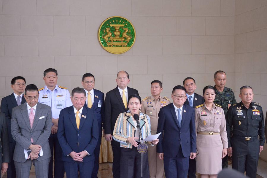 A primeira-ministra tailandesa, Paetongtarn Shinawatra (2º à direita, frente), recebe imprensa na sede do governo em Bancoc, Tailândia, no dia 23 de junho de 2025. (Xinhua/Rachen Sageamsak)