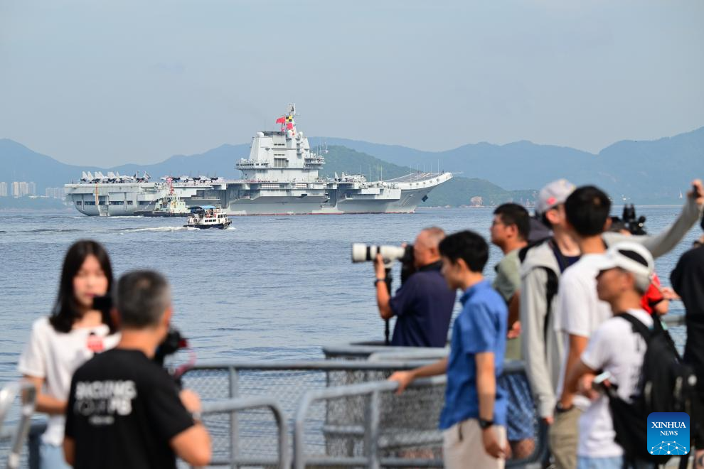 Por volta das 8h, a frota composta pelo Shandong e três outros navios entrou no Porto de Victoria. Mais de 700 oficiais e soldados formaram filas representando os caracteres chineses "país seguro, lar doce" no convés de voo do Shandong.