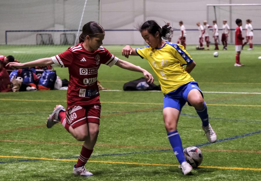 Jogadoras em disputa nos Jogos Amistosos de Futebol Juvenil Sino-Finlandês, no dia 2 de julho de 2025. (Xinhua/Zhang Zhaoqing)