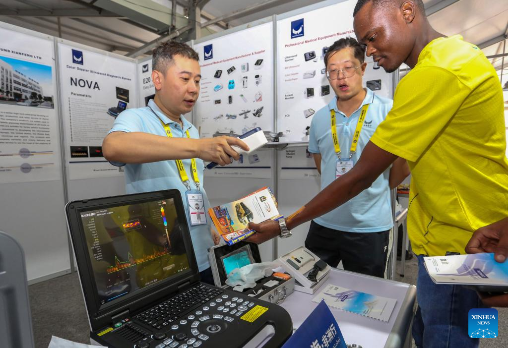 Expositores chineses mostram dispositivos médicos a um visitante tanzaniano na 49ª edição da Feira Internacional de Comércio de Dar es Salã (DITF, na sigla em inglês), em Dar es Salã, Tanzânia, no dia 6 de julho de 2025. A 49ª edição da Feira Internacional de Comércio de Dar es Salã (DITF) foi um marco significativo no domingo com a celebração do Dia da China, destacando a crescente parceria econômica e cultural entre China e Tanzânia, disse uma autoridade tanzaniana. (Xinhua/Emmanuel Herman)