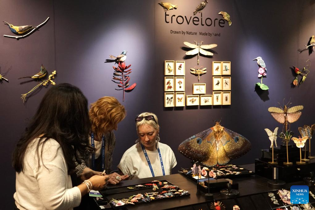 Visitantes no estande da Trovelore, marca de joias artesanais de Phoenix, na feira de verão Las Vegas Market 2025, em Las Vegas, Nevada, Estados Unidos, em 29 de julho de 2025. (Foto por Zeng Hui/Xinhua)