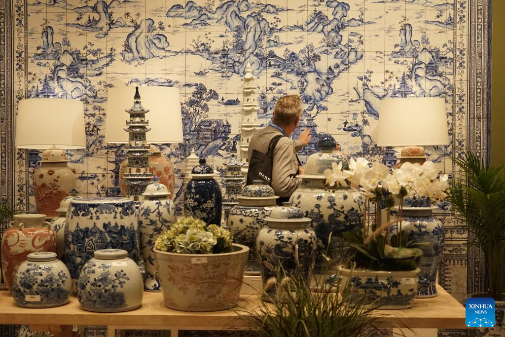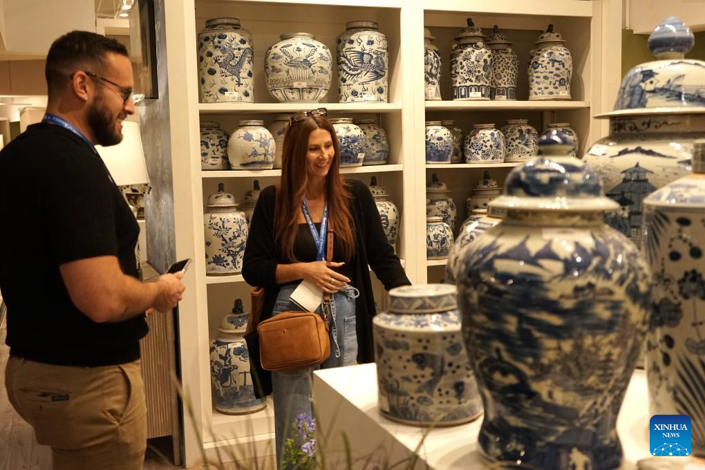 Visitantes no salão de exposições da Lily's Living, uma empresa de Gardena especializada em móveis tradicionais chineses de madeira e cerâmica, na feira de verão Las Vegas Market 2025, em Las Vegas, Nevada, Estados Unidos, em 28 de julho de 2025. (Foto por Zeng Hui/Xinhua)