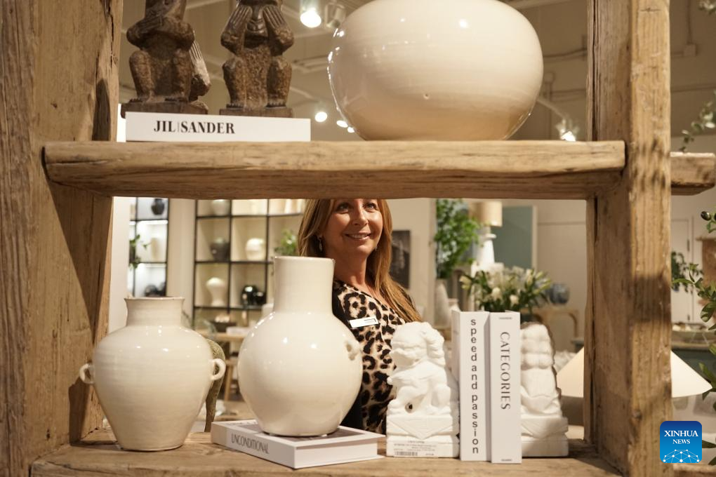 Visitante no salão de exposições da Lily's Living, uma empresa de Gardena especializada em móveis tradicionais chineses de madeira e cerâmica, na feira de verão Las Vegas Market 2025, em Las Vegas, Nevada, Estados Unidos, em 28 de julho de 2025. (Foto por Zeng Hui/Xinhua)