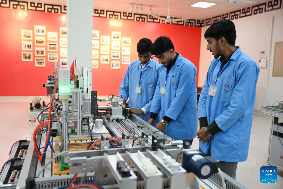 Estudantes operam uma máquina na Oficina Luban em Lahore, Paquistão, em 4 de agosto de 2025. A Oficina Luban tem laboratórios de treinamento modernos, equipamentos e plataformas digitais de aprendizagem em conformidade com os padrões técnicos chineses, e já treinou mais de 1.000 estudantes até o momento. (Xinhua/Ahmad Kamal)