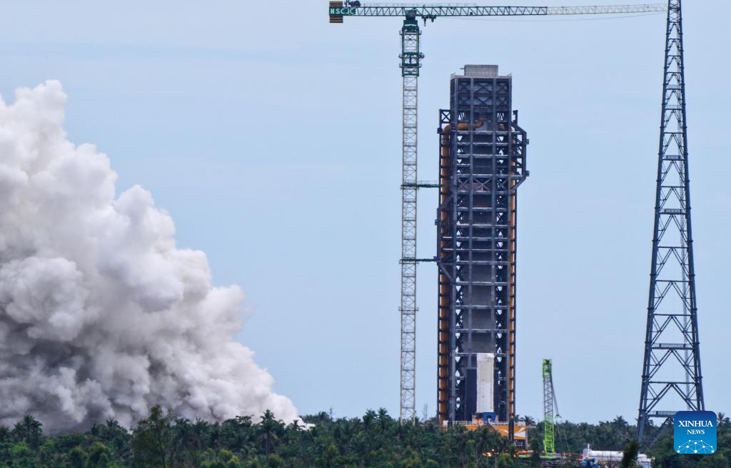 Wenchang, Hainan, 15 ago (Xinhua) -- O foguete transportador Longa Marcha-10 da China, o veículo de lançamento tripulado de nova geração do país, completou com sucesso o primeiro teste de ignição estática na sexta-feira no Campo de Lançamento Espacial de Wenchang, na província insular de Hainan, no sul do país, anunciou a Agência Espacial Tripulada da China (CMSA).