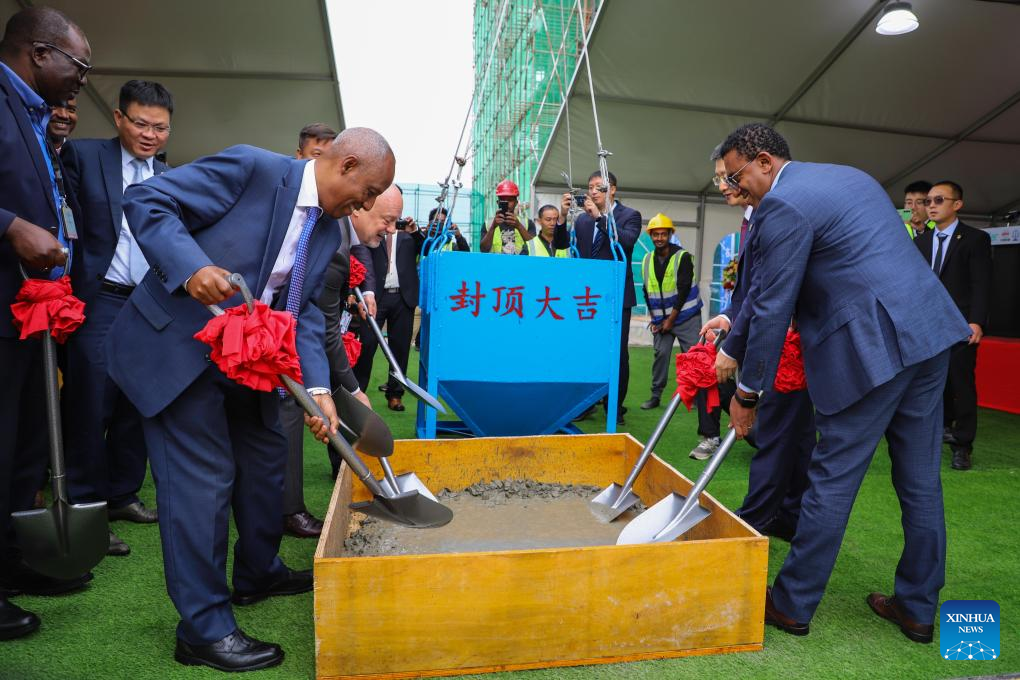Foto tirada em 18 de agosto de 2025 mostra cerimônia de inauguração do novo prédio da sede do Ethiopian Airlines Group em Adis Abeba, Etiópia. O novo prédio da sede do Ethiopian Airlines Group, que está em construção em Adis Abeba, atingiu seu topo, marcando a conclusão de suas principais obras estruturais. A cerimônia de inauguração da estrutura de 45 metros de altura foi realizada na segunda-feira, com a presença de representantes do Ethiopian Airlines Group e da China Civil Engineering Construction Corporation (CCECC). (Xinhua/Han Xu)
