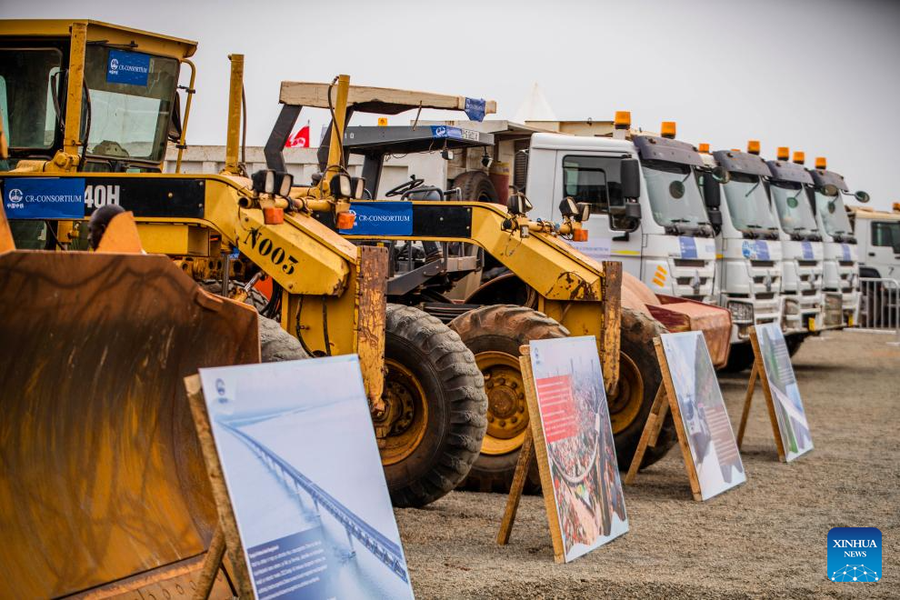 Foto mostra equipamento de construção na cerimônia de lançamento da pedra fundamental de um projeto ferroviário transfronteiriço ligando Uvinza, no oeste da Tanzânia, a Musongati, no leste do Burundi, em Musongati, Burundi, em 16 de agosto de 2025. Tanzânia e Burundi lançaram oficialmente no sábado a construção de uma moderna ferrovia de bitola padrão (SGR, na sigla m inglês) ligando Uvinza, no oeste da Tanzânia, a Musongati, no leste do Burundi. De acordo com um representante do China Railway Group Limited, que lidera o consórcio que está construindo a linha, a ferrovia transfronteiriça, projetada com bitola padrão internacional de 1.435 mm e eletrificação completa, deverá ser concluída por volta de 2030. (Projeto SGR Uvinza-Musongati do China Railway Group Limited/Divulgação via Xinhua)