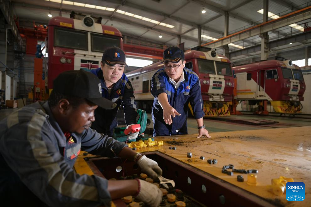 Os engenheiros chineses Zhang Wenqi (direita) e Guo Xupeng (centro) orientam o trabalhador queniano David Kinoti para consertar equipamentos na oficina de manutenção de locomotivas da Africa Star Railway Operation Company Limited (Afristar), em Nairóbi, Quênia, em 19 de agosto de 2025. A Ferrovia de Bitola Padrão Mombasa-Nairóbi (SGR, na sigla em inglês), construída pela China, no Quênia, registrou 3.000 dias de operação segura até sábado, informou a Africa Star Railway Operation Company Limited (Afristar) em comunicado à imprensa no domingo. Desde seu lançamento em 31 de maio de 2017, a ferrovia transportou quase 15,93 milhões de passageiros e mais de 41,96 milhões de toneladas de carga, de acordo com a Afristar, que administra e mantém a linha. (Xinhua/Yang Guang)