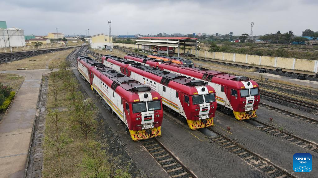 Foto aérea de drone mostra locomotivas em serviço na Ferrovia de Bitola Padrão Mombasa-Nairóbi no pátio de operação e manutenção de locomotivas da Africa Star Railway Operation Company Limited (Afristar) em Nairóbi, Quênia, em 19 de agosto de 2025. A Ferrovia de Bitola Padrão Mombasa-Nairóbi (SGR, na sigla em inglês), construída pela China, no Quênia, registrou 3.000 dias de operação segura até sábado, informou a Africa Star Railway Operation Company Limited (Afristar) em comunicado à imprensa no domingo. Desde seu lançamento em 31 de maio de 2017, a ferrovia transportou quase 15,93 milhões de passageiros e mais de 41,96 milhões de toneladas de carga, de acordo com a Afristar, que administra e mantém a linha. (Xinhua/Yang Guang)