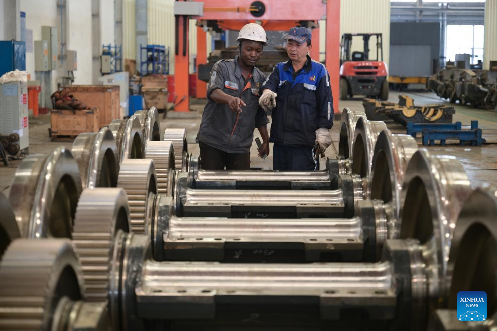 O engenheiro chinês Tang Zhijian (direita) e o trabalhador queniano Clement verificam rodas da locomotiva a ser montada na oficina de manutenção de locomotivas da Africa Star Railway Operation Company Limited (Afristar) em Nairóbi, Quênia, em 19 de agosto de 2025. A Ferrovia de Bitola Padrão Mombasa-Nairóbi (SGR, na sigla em inglês), construída pela China, no Quênia, registrou 3.000 dias de operação segura até sábado, informou a Africa Star Railway Operation Company Limited (Afristar) em comunicado à imprensa no domingo. Desde seu lançamento em 31 de maio de 2017, a ferrovia transportou quase 15,93 milhões de passageiros e mais de 41,96 milhões de toneladas de carga, de acordo com a Afristar, que administra e mantém a linha. (Xinhua/Yang Guang)