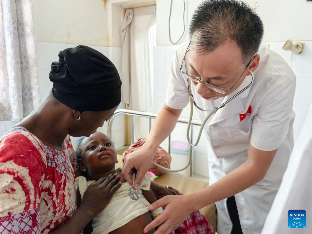 Um profissional da 26ª turma da equipe médica chinesa em Serra Leoa examina criança com tétano em Freetown, Serra Leoa, em 21 de agosto de 2025. (26ª turma da equipe médica chinesa para Serra Leoa/Divulgação via Xinhua)