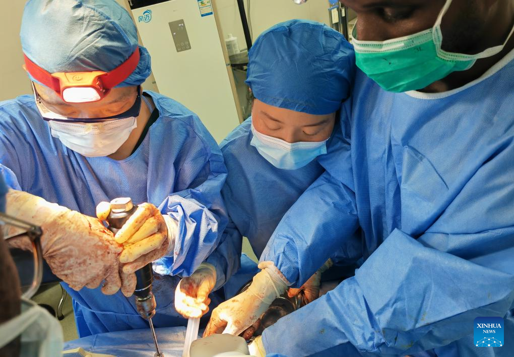 Profissionais da 26ª turma da equipe médica chinesa em Serra Leoa realizam cirurgia em um paciente local em Freetown, Serra Leoa, em 12 de junho de 2025. (26ª turma da equipe médica chinesa para Serra Leoa/Divulgação via Xinhua)