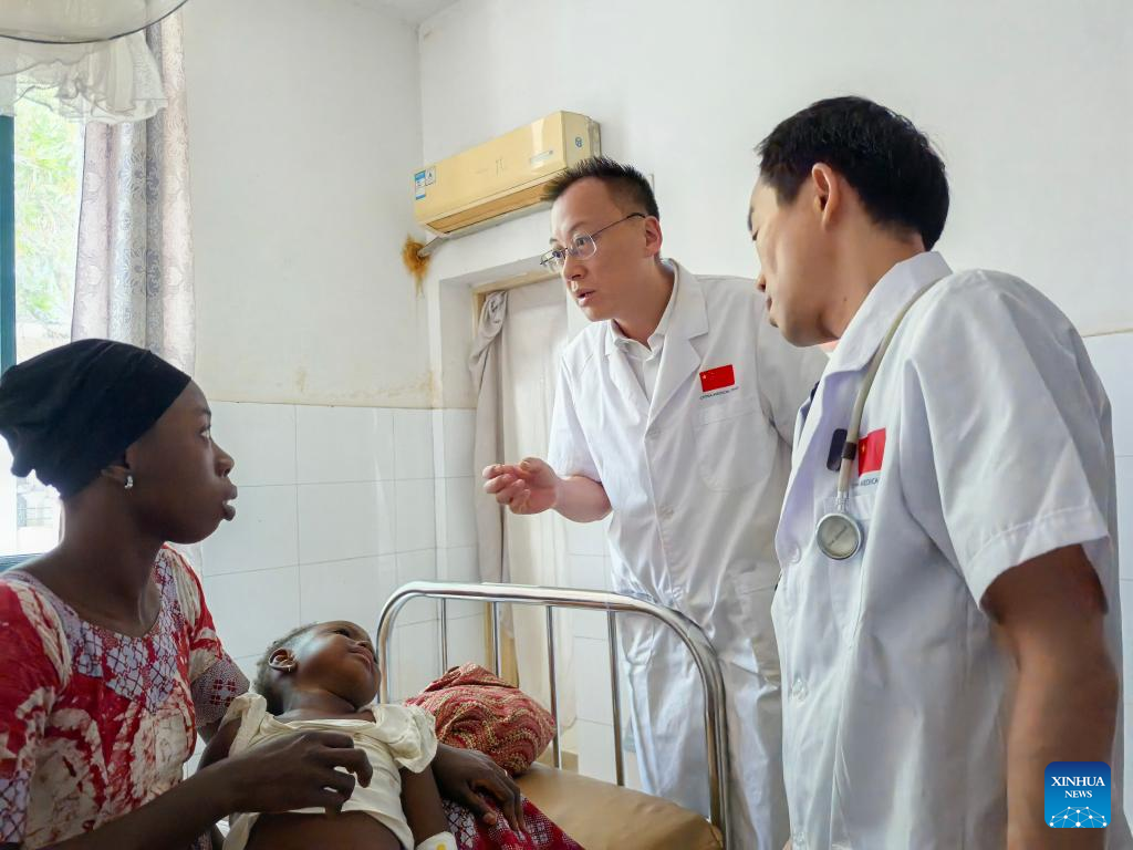 Profissionais da 26ª turma da equipe médica chinesa em Serra Leoa em consulta médica de criança com tétano em Freetown, Serra Leoa, em 21 de agosto de 2025. (26ª turma da equipe médica chinesa para Serra Leoa/Divulgação via Xinhua)