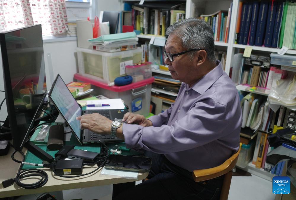 O acadêmico cingapuriano Lim Shao Bin analisa cópias de materiais de arquivo em sua casa em Cingapura, em 23 de agosto de 2025. (Xinhua/Shu Chang)