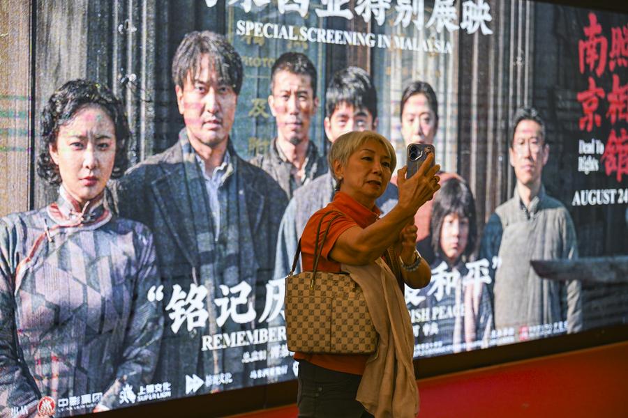 Uma mulher tira selfies em frente a um pôster de filme "Dead To Rights" em Kuala Lumpur, Malásia, em 24 de agosto de 2025. A estreia malaia de "Dead To Rights", um filme chinês histórico sobre o Massacre de Nanjing de 1937, foi realizada no domingo em Kuala Lumpur, repercutindo fortemente entre o público. (Xinhua/Cheng Yiheng)
