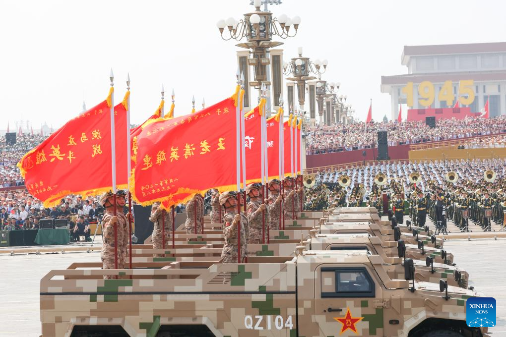 Uma formação de 80 bandeiras em homenagem a unidades militares heroicas da guerra marchou pela Praça Tian'anmen, destacando a posição da China como o primeiro país a se levantar contra a agressão fascista com a resistência mais duradoura, que começou em 1931.