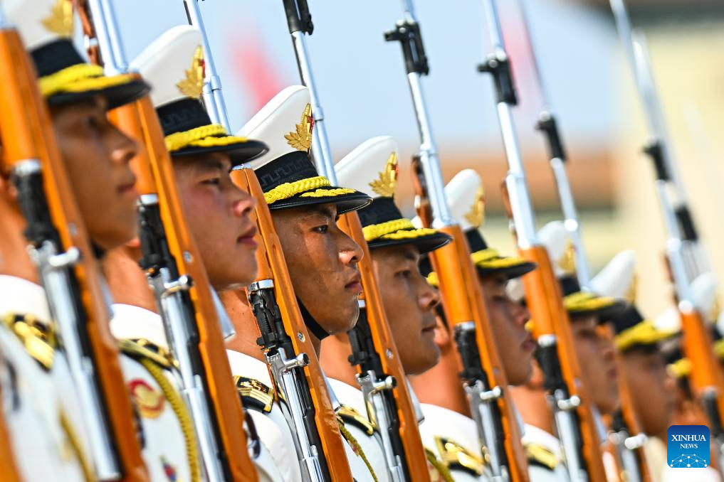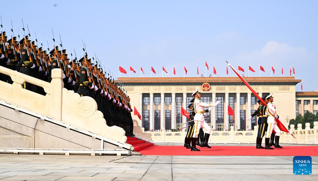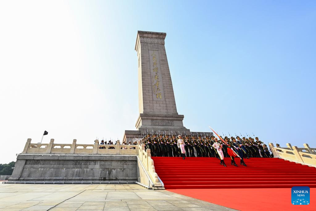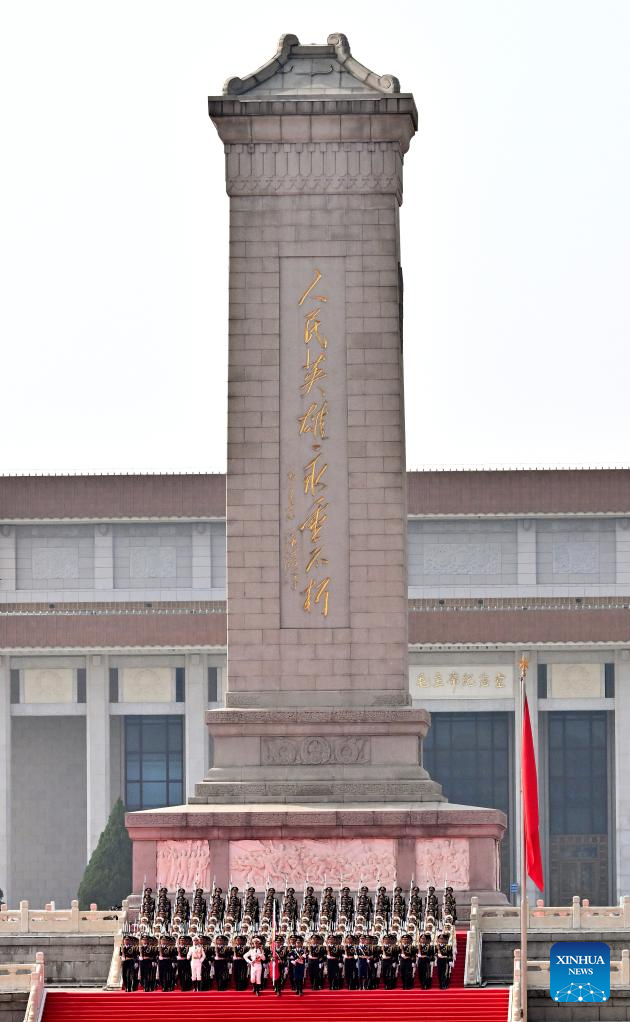 Em meio a salvas de canhão, a guarda de honra escoltou a bandeira nacional do Monumento aos Heróis do Povo, no centro da praça, em direção norte até o mastro.