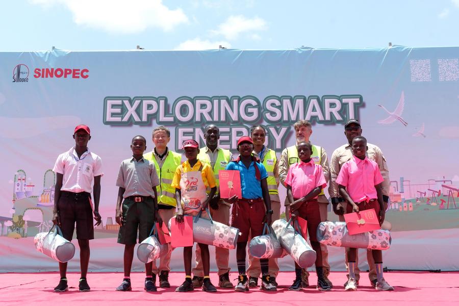 Participantes do concurso de desenho posam para foto em grupo no Dia de Portas Abertas ao Público, organizado pela petrolífera chinesa Sinopec, na Unidade Central de Processamento do campo petrolífero de Tilenga, em Buliisa, Uganda, em 13 de agosto de 2025. (Foto por Hajarah Nalwadda/Xinhua)
