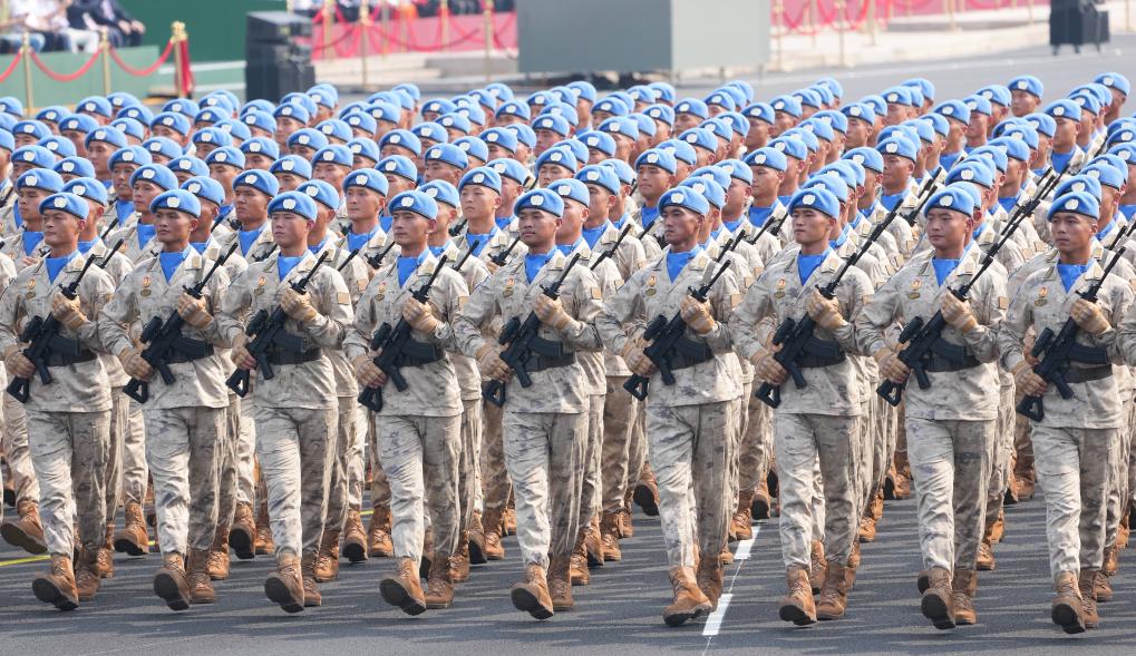 Formação chinesa de forças de paz da ONU participa de desfile militar em Beijing, capital da China, em 3 de setembro de 2025. (Xinhua/Wang Jianhua)