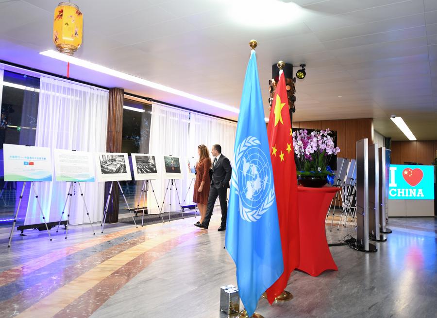 Participantes observam exposição fotográfica chamada "Abraçando um Futuro Compartilhado: Iniciativas e Contribuições Globais da China" na sede da Organização Mundial da Propriedade Intelectual em Genebra, Suíça, 25 de setembro de 2025. (Xinhua/Lian Yi)