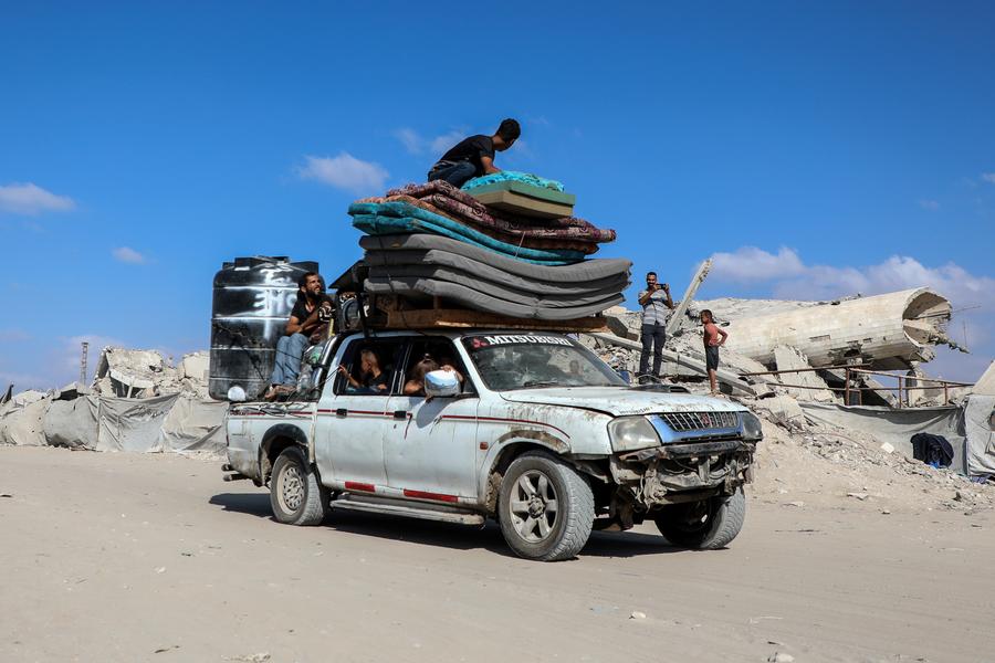 Palestinos deslocados com seus pertences fogem do norte da Faixa de Gaza em direção ao sul, em 9 de setembro de 2025. (Foto por Rizek Abdeljawad/Xinhua)