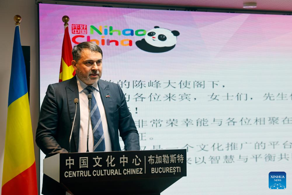 Cosmin Corendea, chefe do Grupo de Amizade Romênia-China no parlamento, discursa na cerimônia de abertura da Feira de Turismo da China 2025, em Bucareste, Romênia, em 10 de outubro de 2025. A Feira de Turismo da China 2025 começou na sexta-feira no Centro Cultural Chinês em Bucareste, reunindo mais de 100 representantes dos setores de turismo, cultura e educação da China e da Romênia. A feira de três dias, organizada pelo Centro Cultural Chinês em Bucareste e pela Associação Nacional de Agências de Viagens da Romênia, conta com 17 estandes dos setores cultural e turístico. Além de exposições de produtos turísticos, o evento tem uma área de consultoria "Estude na China", exibições de vídeos sobre turismo e experiências culturais, incluindo arte do chá, caligrafia e exposições de culinária chinesa. (Foto por Cristian Cristel/Xinhua)