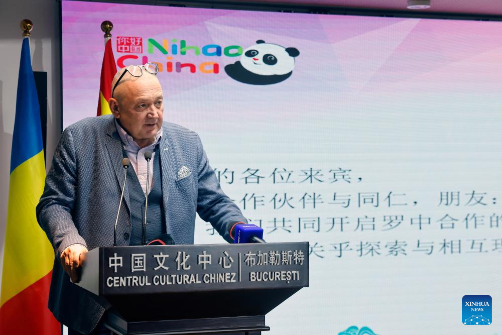Alin Burcea, presidente da Associação Nacional de Agências de Viagens da Romênia, discursa na cerimônia de abertura da Feira de Turismo da China 2025, em Bucareste, Romênia, em 10 de outubro de 2025. A Feira de Turismo da China 2025 começou na sexta-feira no Centro Cultural Chinês em Bucareste, reunindo mais de 100 representantes dos setores de turismo, cultura e educação da China e da Romênia. A feira de três dias, organizada pelo Centro Cultural Chinês em Bucareste e pela Associação Nacional de Agências de Viagens da Romênia, conta com 17 estandes dos setores cultural e turístico. Além de exposições de produtos turísticos, o evento tem uma área de consultoria "Estude na China", exibições de vídeos sobre turismo e experiências culturais, incluindo arte do chá, caligrafia e exposições de culinária chinesa. (Foto por Cristian Cristel/Xinhua)