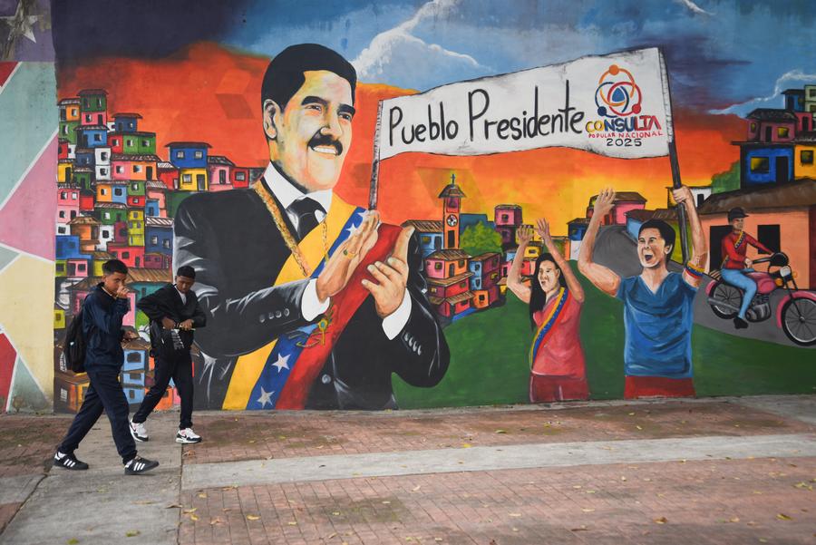 Homens passam em frente a um mural em homenagem ao presidente Nicolás Maduro em Caracas, Venezuela, em 22 de setembro de 2025. (Foto por Marcos Salgado/Xinhua)