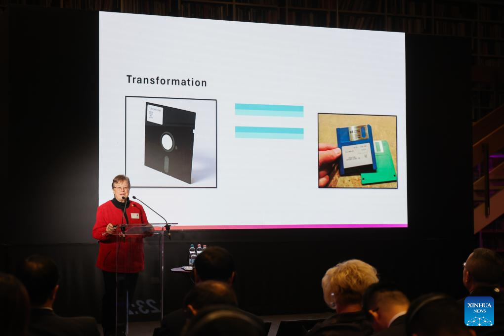 Helen Mandl, secretária-geral adjunta da Federação Internacional de Associações e Instituições de Bibliotecas, discursa na 4ª edição do Fórum de Curadores da União de Bibliotecas da China e dos Países da Europa Central e Oriental (PECO), em Budapeste, Hungria, em 20 de outubro de 2025. A 4ª edição do Fórum de Curadores da União de Bibliotecas da China-PECO começou na segunda-feira na Biblioteca Nacional Szechenyi, na Hungria, reunindo especialistas para discutir o futuro das bibliotecas na era digital. (Foto por Attila Volgyi/Xinhua)