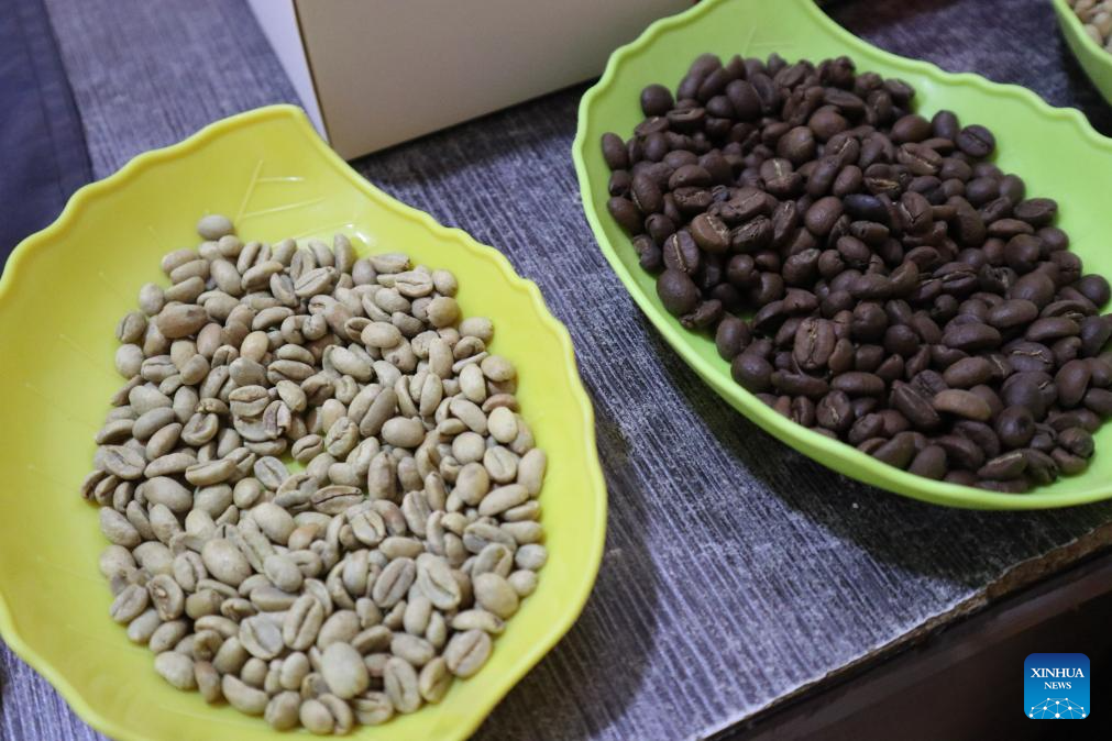 Grãos de café são exibidos na Awo Coffee em Adis Abeba, Etiópia, em 26 de outubro de 2025. (Xinhua/Liu Fangqiang)