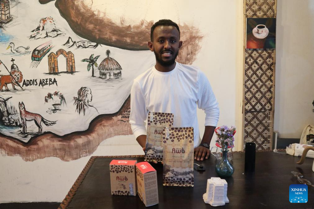 O gerente de marketing da Awo, Kaleab Fekad, demonstra produtos de café em Adis Abeba, Etiópia, em 26 de outubro de 2025. (Xinhua/Liu Fangqiang)
