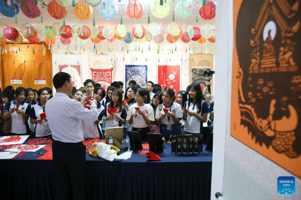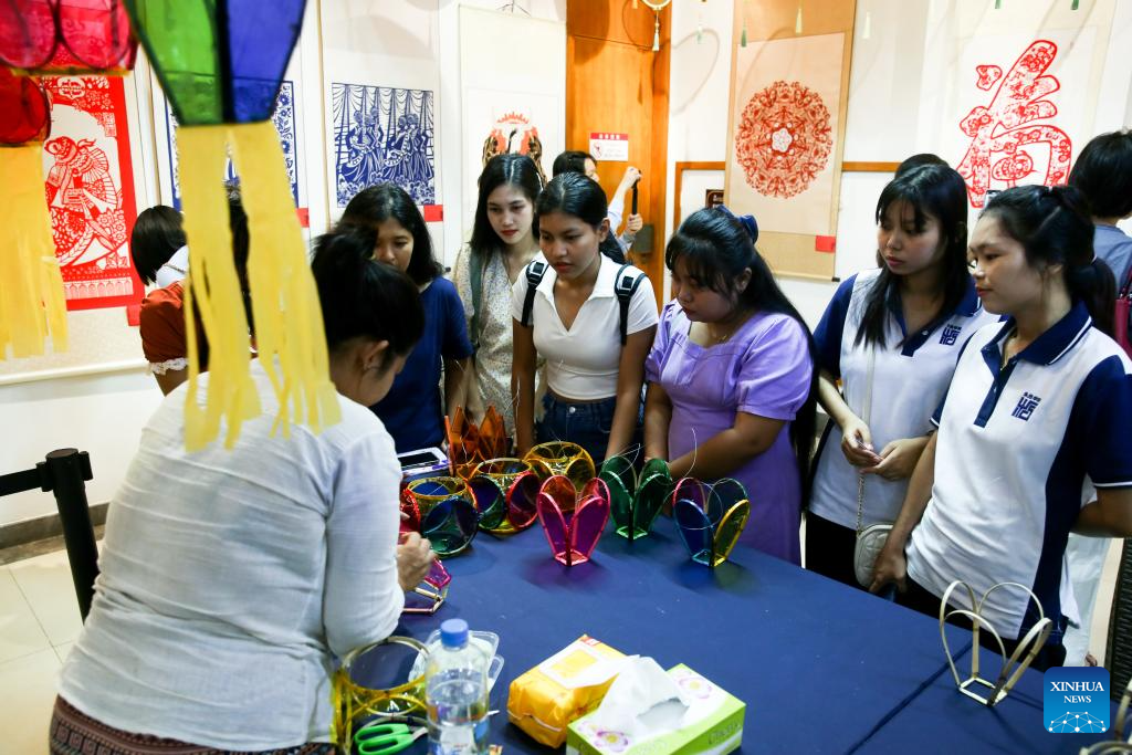 Estudantes aprendem a arte tradicional chinesa de recorte de papel em uma exposição no Centro Cultural da China em Rangum, Mianmar, em 5 de novembro de 2025. Uma exposição de arte tradicional chinesa de recorte de papel foi realizada no Centro Cultural da China em Rangum, na quarta-feira. (Xinhua/Myo Kyaw Soe)