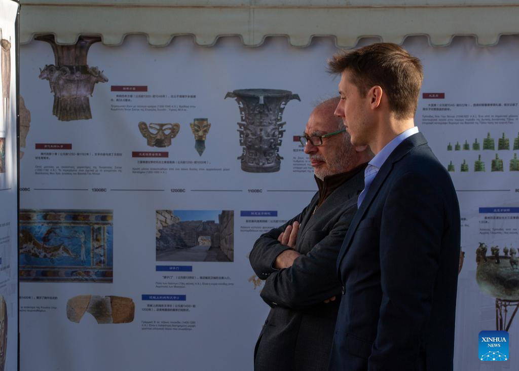 Acadêmicos visitam exposição fotográfica na Escola Chinesa de Estudos Clássicos (CSCSA, na sigla em inglês) em Atenas, Grécia, em 7 de novembro de 2025. A Escola Chinesa de Estudos Clássicos (CSCSA) realizou uma série de seminários e atividades acadêmicas em Atenas na sexta-feira para comemorar seu primeiro aniversário, com acadêmicos da China e da Grécia trocando experiências sobre pesquisa arqueológica e cooperação acadêmica. (Foto por Marios Lolos/Xinhua)