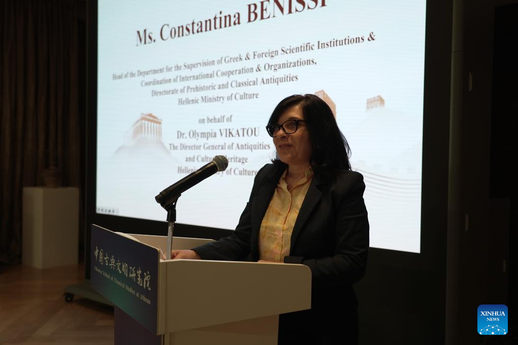 Constantina Benissi, representante do Ministério da Cultura grego, discursa na Escola Chinesa de Estudos Clássicos (CSCSA, na sigla em inglês) em Atenas, Grécia, em 7 de novembro de 2025. A Escola Chinesa de Estudos Clássicos (CSCSA) realizou uma série de seminários e atividades acadêmicas em Atenas na sexta-feira para comemorar seu primeiro aniversário, com acadêmicos da China e da Grécia trocando experiências sobre pesquisa arqueológica e cooperação acadêmica. (Foto por Marios Lolos/Xinhua)