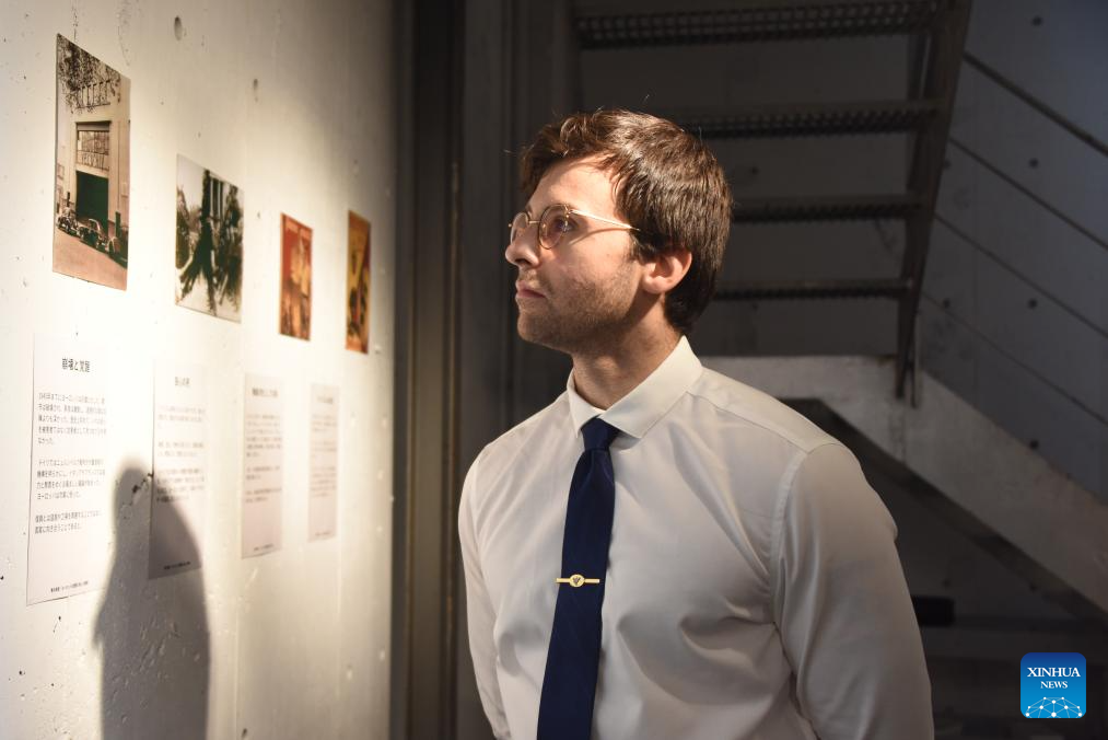 Marcus Detrez observa fotos na exposição fotográfica em Tóquio, Japão, em 29 de outubro de 2025. O jovem francês, Marcus Detrez, realizou recentemente uma exposição fotográfica em Tóquio, exibindo dezenas de fotocópias e algumas fotos originais que documentam as atrocidades cometidas pelo exército imperial japonês durante a invasão da China, como o bombardeio de Shanghai e o massacre de civis. (Xinhua/Hu Xiaoge)