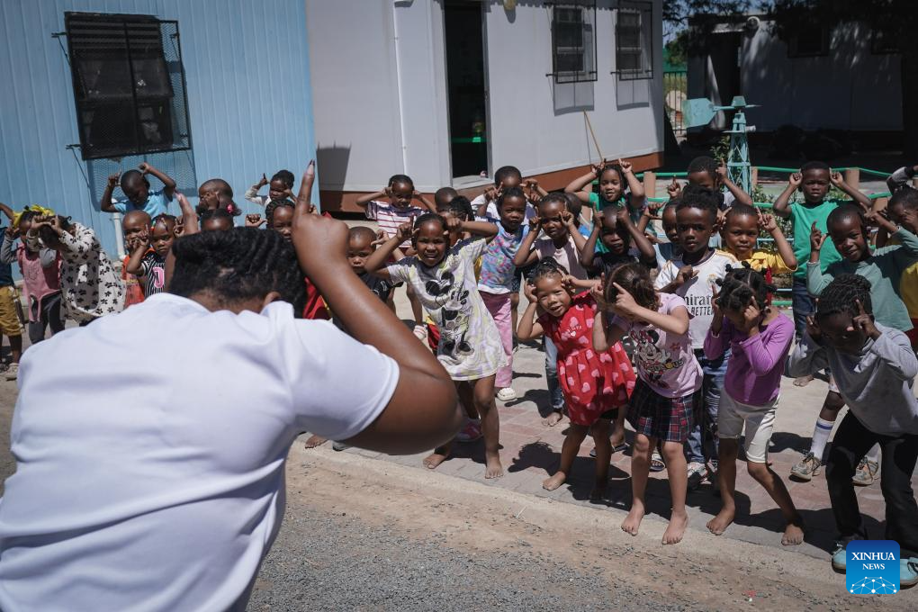 Uma professora interage com crianças em um centro de educação infantil operado pela Longyuan South Africa Renewables Ltd. em De Aar, Cabo Setentrional, África do Sul, em 22 de outubro de 2025. (Xinhua/Han Xu)
