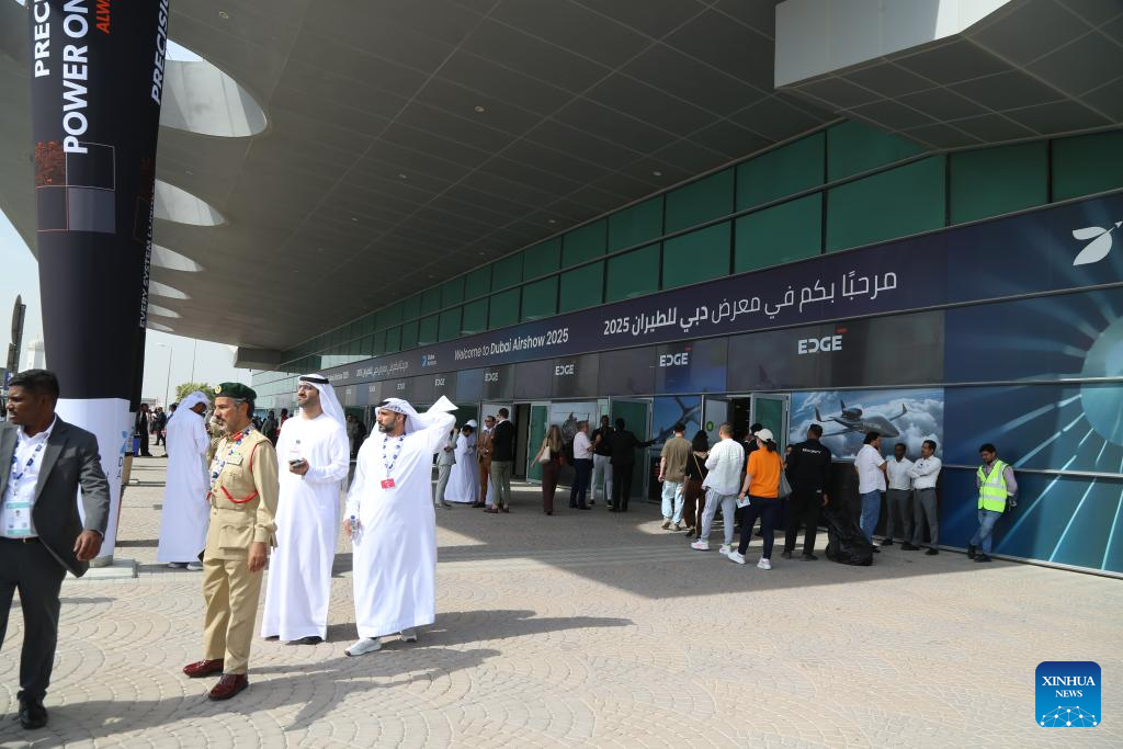 Visitantes na 19ª edição do Dubai Airshow, em Dubai, Emirados Árabes Unidos (EAU), em 17 de novembro de 2025. A 19ª edição do Dubai Airshow começou na segunda-feira no Dubai World Central, apresentando a estreia no Oriente Médio de duas aeronaves C919 de fabricação chinesa. Os organizadores disseram que o evento de cinco dias, realizado sob o tema "O Futuro Está Aqui", atraiu mais de 1.500 expositores, incluindo 440 participantes pela primeira vez. A Corporação de Aeronaves Comerciais da China (COMAC, na sigla em inglês), fabricante do C919, está exibindo uma aeronave C919 e uma C909, enquanto a China Southern Airlines trouxe outro C919. A presença do C919 marca sua estreia no Oriente Médio, e a COMAC realizou no local do evento uma demonstração de voo da aeronave de passageiros fabricada na China. (Xinhua/Wen Xinnian)
