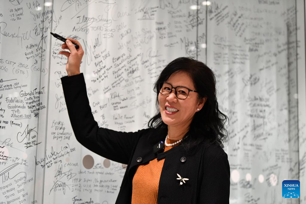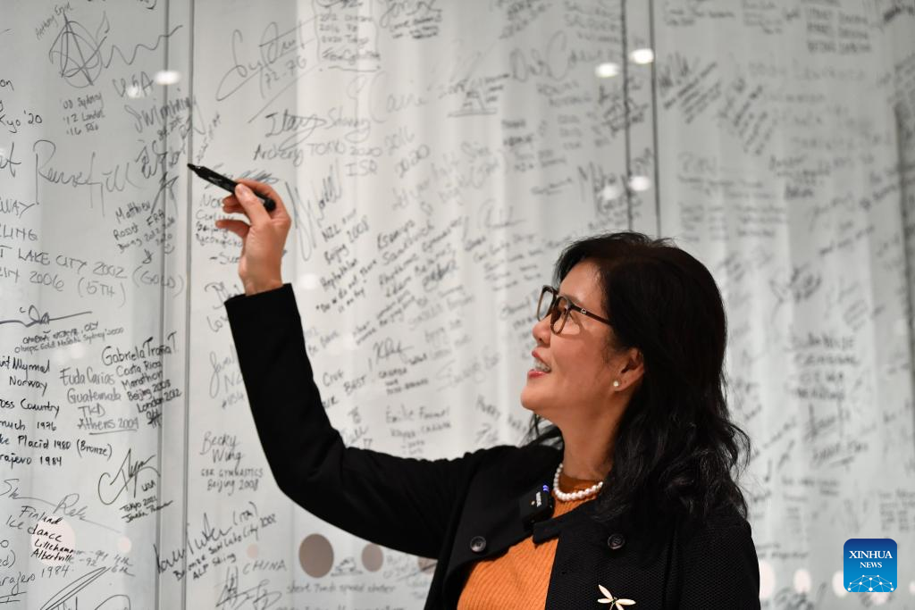 A treinadora chinesa de voleibol, Lang Ping, assina seu nome no Muro dos Olímpicos após ser homenageada com o Prêmio de Reconhecimento pela Carreira de Treinadores do COI, na Casa Olímpica em Lausanne, Suíça, em 24 de novembro de 2025. (Xinhua/Lian Yi)
