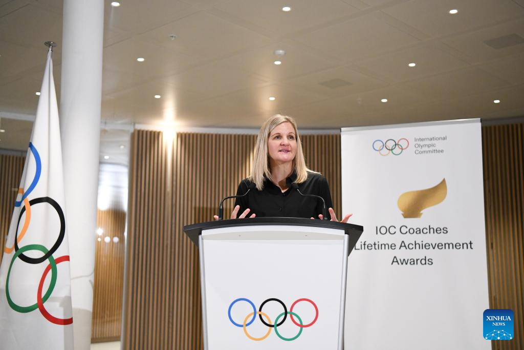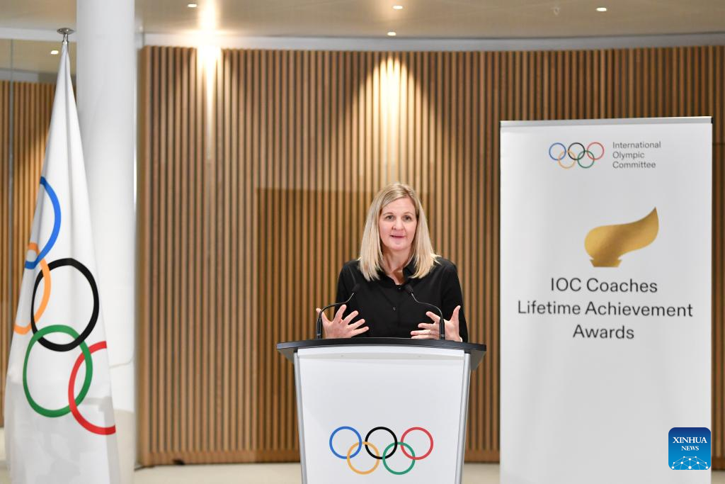 A presidente do COI, Kirsty Coventry, discursa na cerimônia de entrega do Prêmio de Reconhecimento pela Carreira de Treinadores do COI, na Casa Olímpica em Lausanne, Suíça, em 24 de novembro de 2025. (Xinhua/Lian Yi)