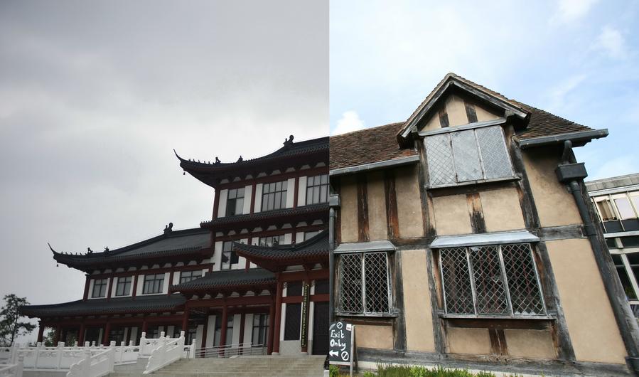 Foto combinada mostra o museu comemorativo do dramaturgo chinês Tang Xianzu em Fuzhou, na Província de Jiangxi, no leste da China (à esquerda, foto por Zhou Mi, da Xinhua, em 12 de outubro de 2016) e a antiga residência do escritor britânico William Shakespeare em Stratford-upon-Avon, no Reino Unido (à direita, foto por Han Yan, da Xinhua, em 21 de julho de 2016). (Xinhua)