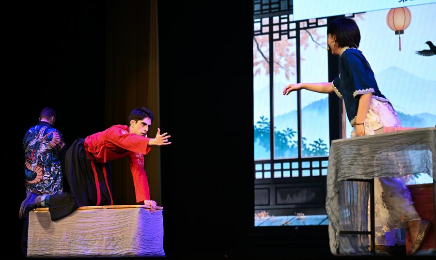 Atores da Universidade de Birmingham apresentam a versão em inglês de "O Pavilhão das Peônias" em Fuzhou, Província de Jiangxi, leste da China, em 25 de outubro de 2025. (Foto por Dai Qingfu/Xinhua)