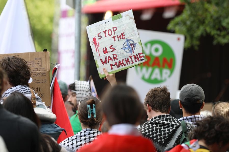 Manifestantes com cartazes são fotografados em Haia, Holanda, em 22 de junho de 2025. O protesto, que contou com a presença de centenas de pessoas, ocorreu dois dias antes da cúpula da OTAN, onde é esperado que os Estados-membros pressionem por um aumento nos gastos com defesa. (Xinhua/Zhao Dingzhe)