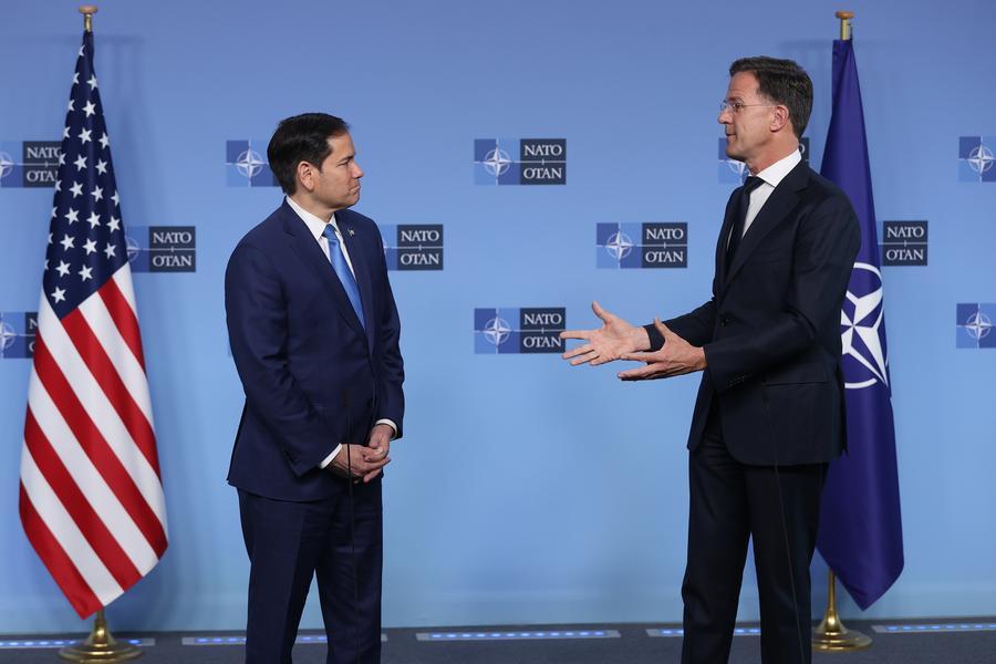 O secretário-geral da Organização do Tratado do Atlântico Norte (OTAN), Mark Rutte (direita), e o secretário de Estado dos EUA, Marco Rubio, conversam com a imprensa durante uma reunião de ministros das Relações Exteriores da OTAN na sede da OTAN em Bruxelas, Bélgica, em 3 de abril de 2025. (Xinhua/Zhao Dingzhe)