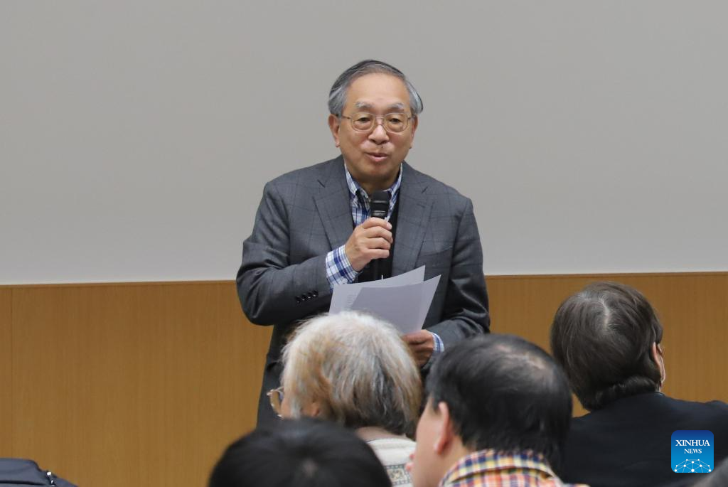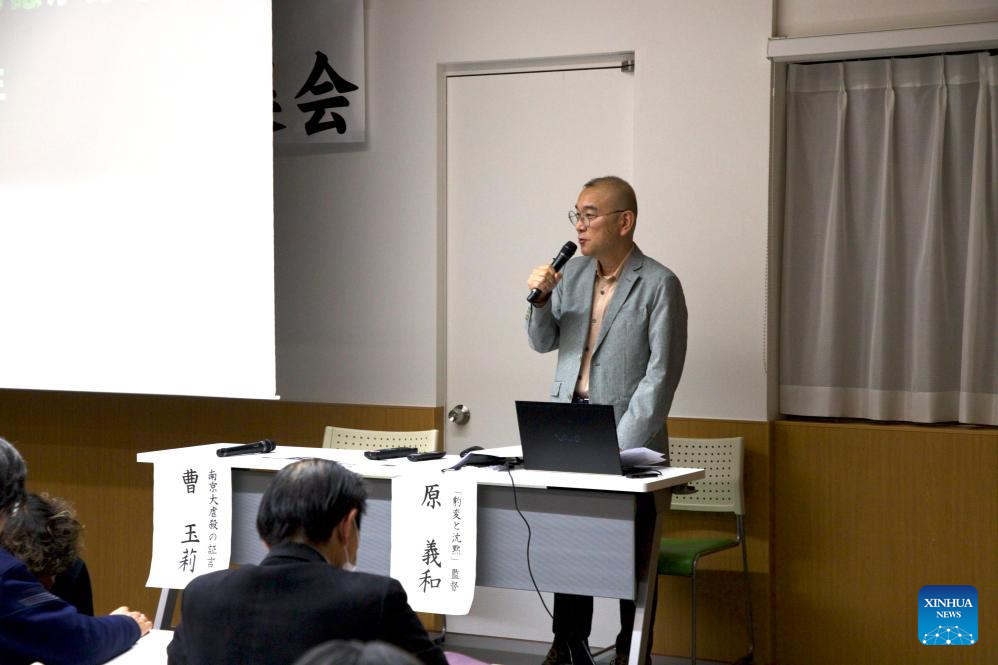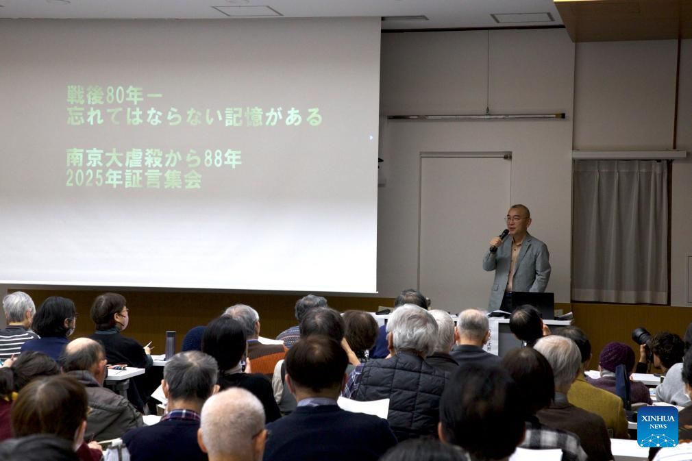 O diretor japonês, Yoshikazu Hara, discursa em uma reunião de depoimentos sobre o Massacre de Nanjing em Tóquio, Japão, em 11 de dezembro de 2025. (Xinhua/Li Ziyue)