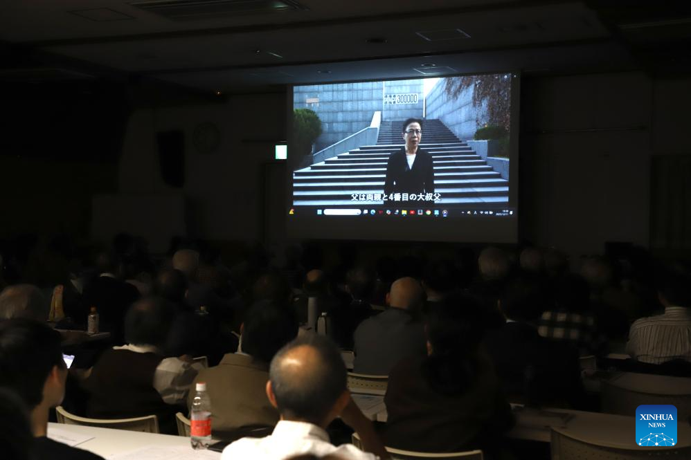 Cao Yuli, filha de dois sobreviventes do Massacre de Nanjing, fala em um depoimento em vídeo durante uma reunião sobre o Massacre de Nanjing em Tóquio, Japão, em 11 de dezembro de 2025. (Xinhua/Li Ziyue)