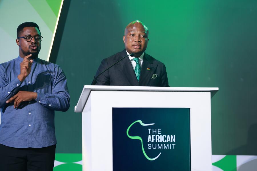 O ministro das Relações Exteriores de Gana, Samuel Okudzeto Ablakwa (direita), discursa na Cúpula Africana em Acra, Gana, em 16 de dezembro de 2025. A primeira Cúpula Africana, com o tema "Construindo uma Nova África Unida", começou na terça-feira em Acra, capital de Gana, reunindo formuladores de políticas e partes interessadas de todo o continente para construir um consenso sobre uma África mais integrada, interdependente e interconectada. (Cúpula Africana/Divulgação via Xinhua)