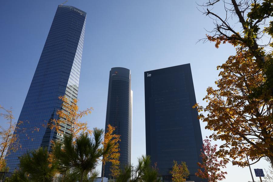 Foto tirada em 19 de outubro de 2021 mostra a Torre IE (direita) em Madri, Espanha. A Torre IE, um novo prédio de ensino da Universidade IE, foi inaugurada em Madri na terça-feira. Com 180 metros de altura, o edifício tem 35 andares e 50.000 metros quadrados de área, o que o torna o terceiro edifício de ensino mais alto do mundo. (Xinhua/Meng Dingbo)