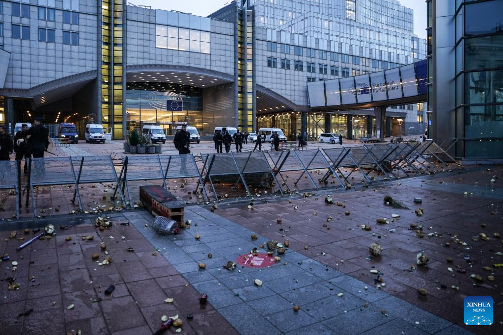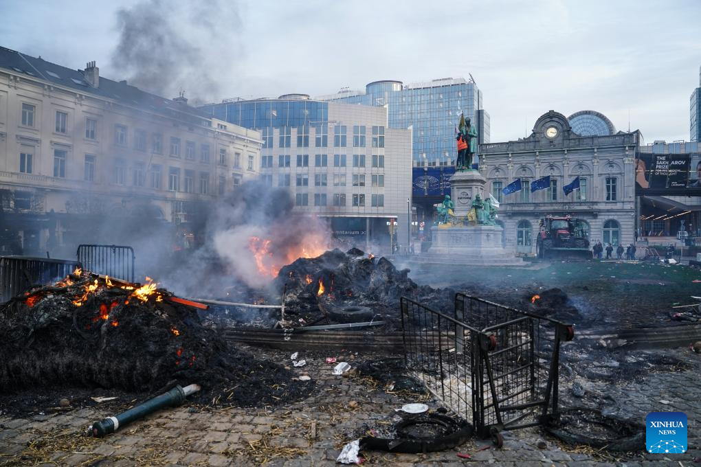 Foto tirada em 18 de dezembro de 2025 mostra cenário após um protesto de agricultores em Bruxelas, Bélgica. Milhares de agricultores de toda a Europa se reuniram perto do Parlamento Europeu e do Edifício Europa, em Bruxelas, na quinta-feira, enquanto os líderes da União Europeia (UE) se reuniam para uma cúpula, com um acordo comercial de longa data com o bloco sul-americano Mercosul na agenda. (Xinhua/Peng Ziyang)