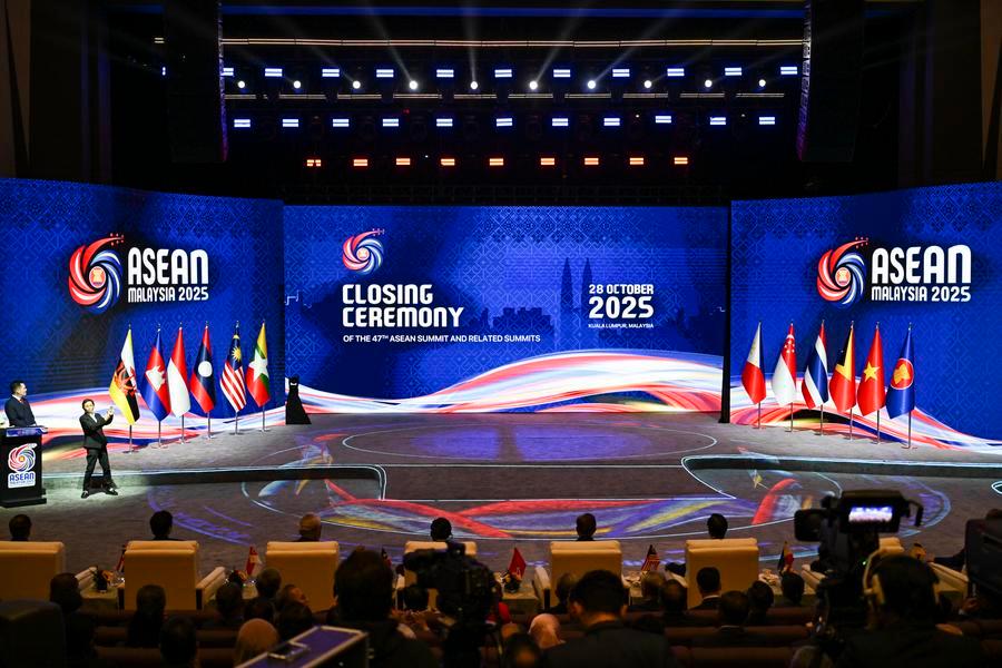 Participantes da cerimônia de encerramento da 47ª edição da Cúpula da Associação das Nações do Sudeste Asiático (ASEAN) e cúpulas relacionadas, realizadas em Kuala Lumpur, Malásia, em 28 de outubro de 2025. (Xinhua/Cheng Yiheng)